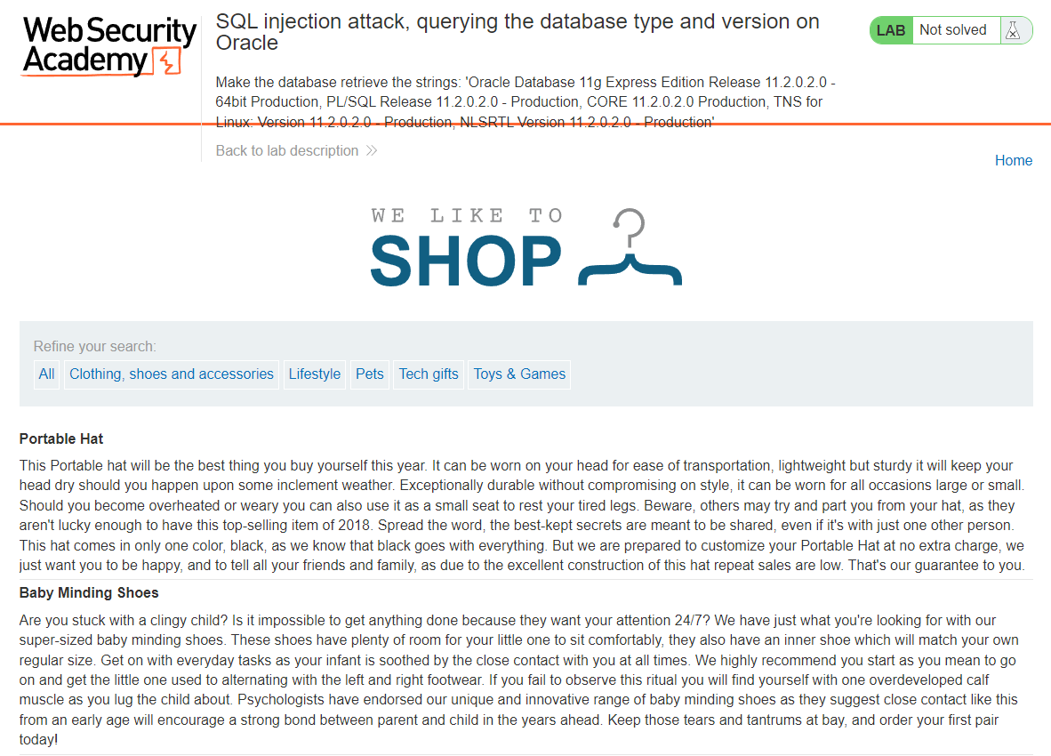 Lab: SQL injection attack, querying the database type and version on Oracle