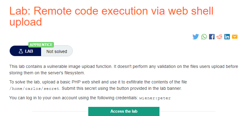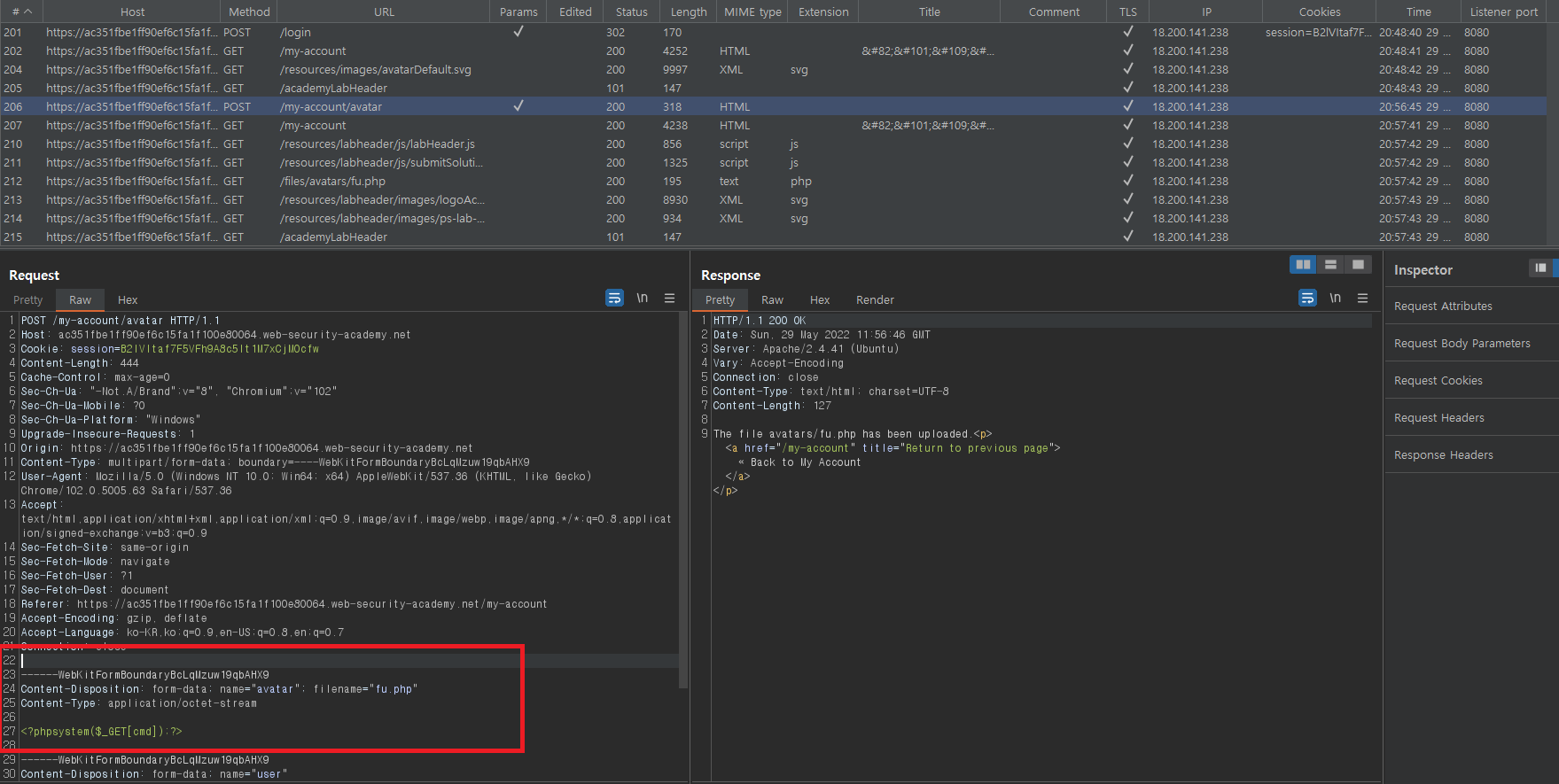 첫 문제는 /home/carlos/secret 이라는 경로에 파일이 있고 올리는 파일은 php 를 사용하라 했다. 이를 종합적으로 이용해서 문제를 풀어보자 첫 번째로 접근해야할 점은 저 경로에 무슨 파일이 있는지 알아내는 것이다.