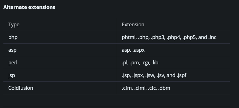 하지만 화면상으로 보여지기만 하지 실행되지 않았기 때문에 이 경우 첫번째로 생각할 수 있는 경우는 확장자를 지정하여 특성 확장자만 실행되도록 코드가 짜져있기 때문에 이를 위회하기 위해서 모든 종류의 확장자를 대입해 보아야 한다. php의 경우 아래 처럼 여러 확장자가 존재한다.