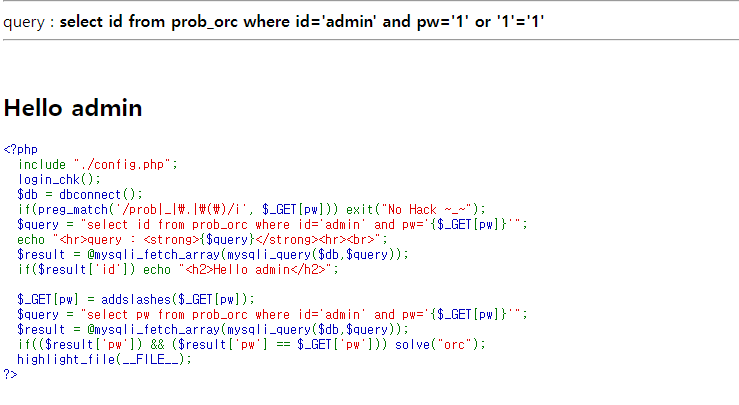 pw = admin' or '1'='1 를 집어 넣으면 id가 틀리더라도 pw 부분은 무조건 참이기 때문에 db의 첫번째를 가져오는데 이번의 경우 admin이 첫번째였다. 만약 첫번째가 아닐 경우 다른 경로로 우회를 해야한다.