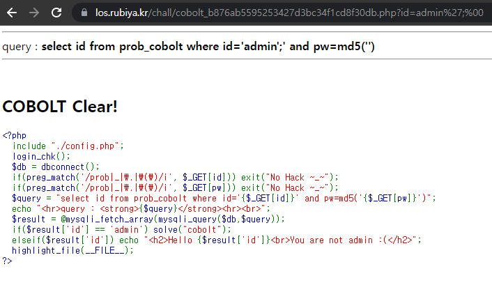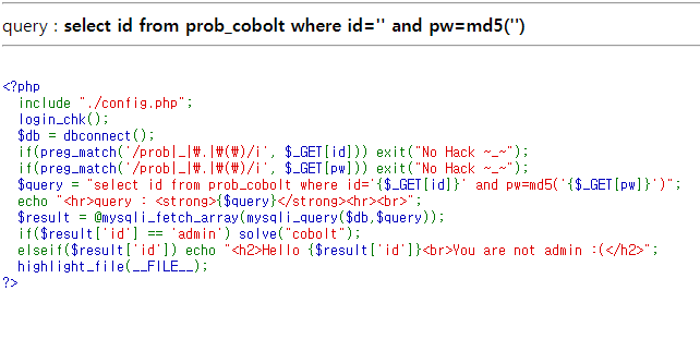 문제 1번과 달라진 점이 있다면 md5를 썼다는 것이다. md5는 암호화를 하는 것으로 복호화와 암호화 둘다 가능한 암호 기법이다. 즉 pw를 a를 입력하여 md5가 암호화하면 1234가 된다고 하자 그 이후에 다시 영어 a를 다시 암호화 해도 1234가 된다. 즉 매칭이 변하지 않는 암호화 기법이다. 다만 여기서는 db의 내용을 파악해야 admin 계정 비밀번호를 알 수 있으니