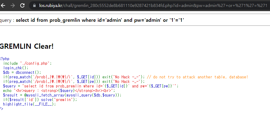 이 문제는 php문을 주고 어떠한 식으로 필터링해야하는지 고민하는 문제이다. 입력창이 없는 이유는 get 방식으로 url에 데이터를 포함해서 오기때문에 url get 방식으로 전달할 데이터를 붙여주기만 하면된다.