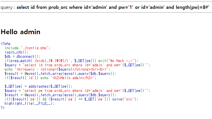 죽어라 풀었는데 안풀렸다. 가만히 생각해보니 pw 부분이 참이기만 하면 hello admin을 출력해 주니 이를 이용하여 length을 우선 알아내고 그 후 자동화 기법을 통해 비밀번호를 추출해 주면 된다. 이를 위해서는 burp suit의 intruder나 파이썬 코드를 이용하여 작성하면된다.