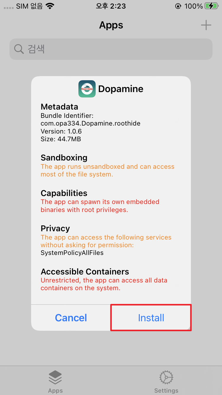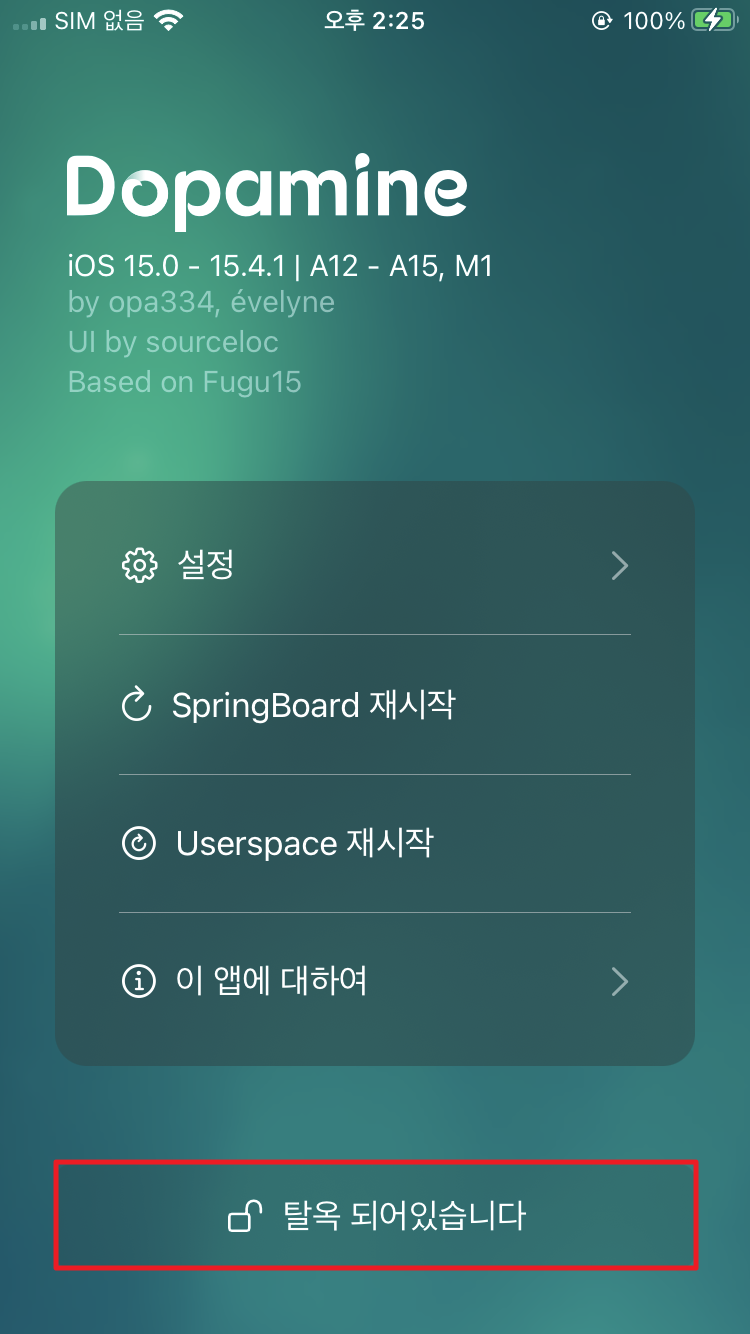 설치된 도파민 앱 접속 시 탈옥 버튼이 있는데 이것만 누르면 탈옥이 완료된다.