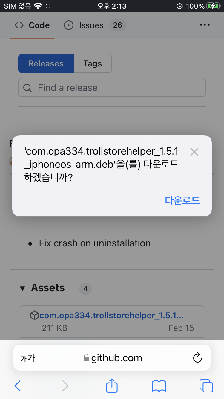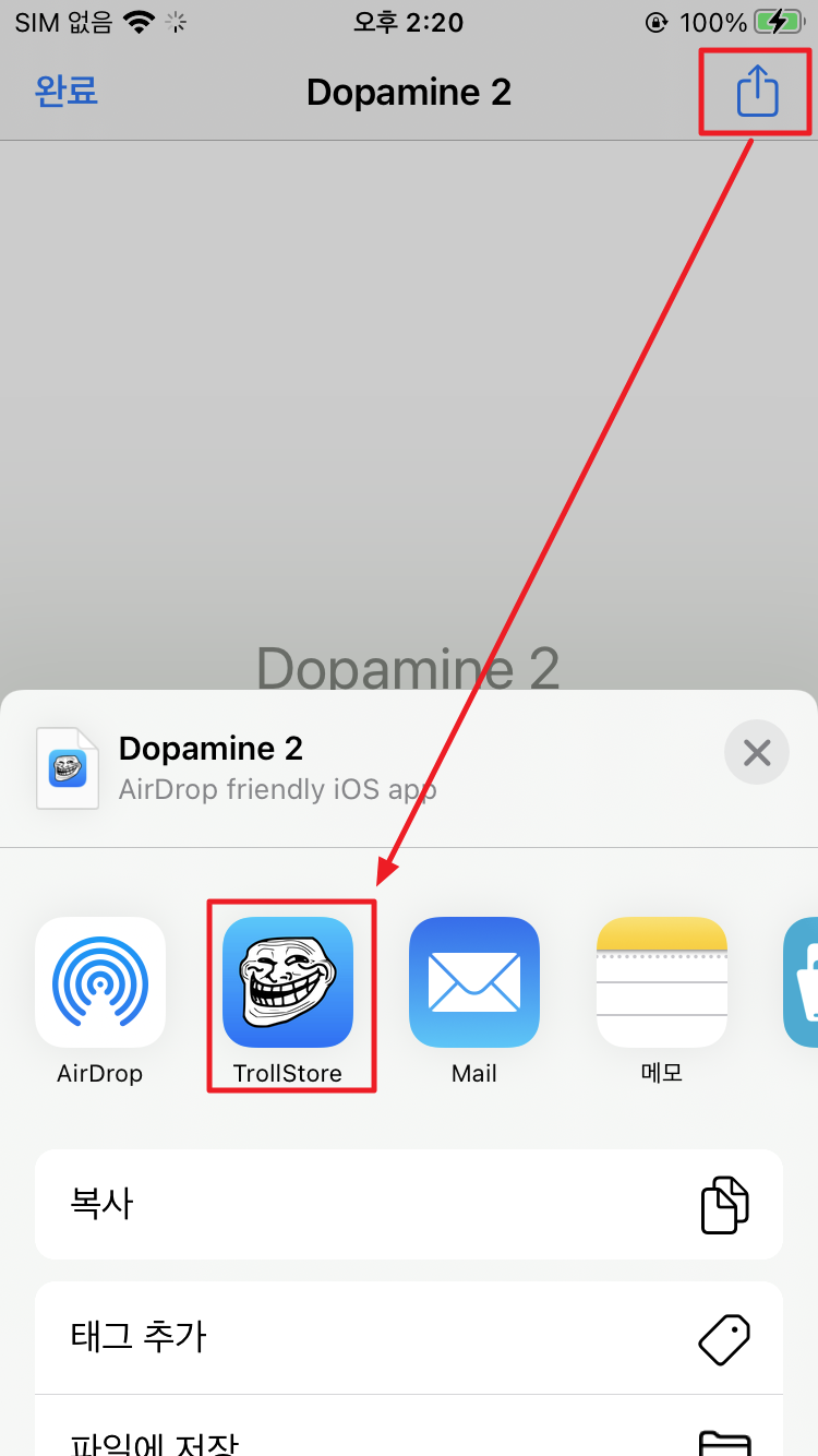 다운로드 후 내보내기를 통해 TrollStore로 해당 설치파일을 열어 Install