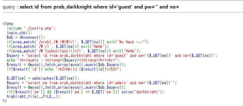select id from prob_darkknight where id='guest' and pw=' " " or id="admin"#