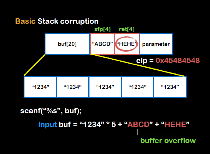 그러면 buffer의 크기 보다 많은 값을 입력시 buffer를 초과해버린다는 것인데 buffer를 넘어가면 sfp(saved frame point)와 ret(return) 의 범위까지 침범하게 되는데 ret라는 부분은 다음 명령어가 실행될 부분을 나타내게 된다.만약 buffer overflow를 통해 ret라는 영역까지 덮어쓰기를 하고 그 다음 명령어의 시작점을 buffer의 시작점으로 한 후 buffer 안에 shellcode를 를 넣어둔다면 자동적으로 shell code를 실행하여 쉘을 획득 할 수 있을 것이다.