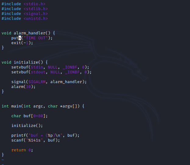 프로그램은 시작 된 30초 후 'Time out'이라는 문구를 남기고 exit(-1)로 프로그램을 종료한다는 의미 인데 여기서 주목해야할 점은 buffer의 크기이다.